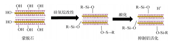 图 2 硅氧烷改性抑制蒙脱石酸化过程中固相铝活化示意图 Fig. 2 Schematic diagram of solid phase aluminum mobilization during acidification inhibition of montmorillonite modified with siloxane |