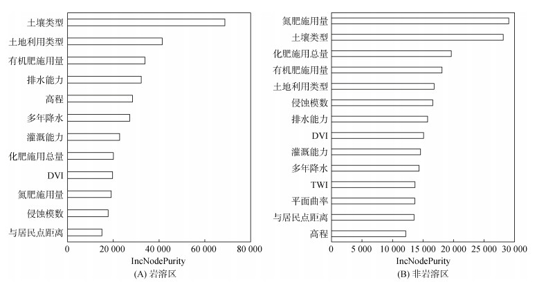 使用ArcGIS 10.2的地理加权回归工具实现GWR模型预测,GWR需去除局部共线性,通过去除VIF > 2.0的变量剔除模型的局部共线性。使用R语言构建RF模型,RF树节点的变量个数(mtry)和树的个数(ntree)是RF的两个重要参数,通过对不同个数辅助变量逐次计算袋外误差(OOB)确定出最优的mtry和ntree值,选择使用最优参数组合进行预测,岩溶区ntree为700、mtry为4;非岩溶区ntree为750,mtry为4。参与RF建模的解释变量相对重要性排序如图 2所示,其中IncNodePurity越大,环境变量越重要。从图 2可以发现,岩溶区的土壤类型、土地利用类型、有机肥施用量、排水能力、高程、多年降水、灌溉能力等是影响土壤有机质含量的主导因素。