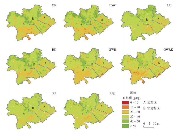 2.4 不同预测模型绘制空间分布图不同预测模型绘制的土壤有机质空间分布如图 3所示,土壤有机质分布的总体趋势基本一致,整体上非岩溶区有机质含量水平高于岩溶区;土壤有机质含量分布集中在20 ~ 40 g/kg,属于中等水平,高值主要集中分布在中北部的岩溶区与非岩溶区交界位置,低值主要集中在西南部。