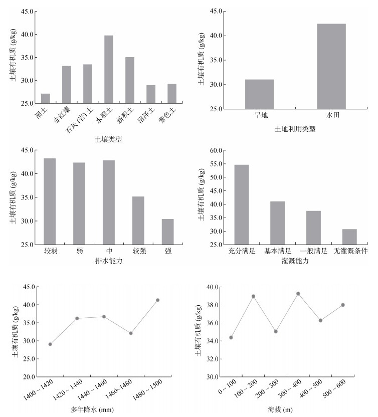 通过比较土壤类型、土地利用类型、排水能力、多年降水、灌溉能力及海拔等环境变量与土壤有机质的关系可知(图 5),水稻土的土壤有机质含量最高,为39.72 g/kg,主要集中分布在中部河谷区;潮土和紫色土的土壤有机质含量较低,潮土主要为潮砂土,该土壤类型易漏水漏肥;紫色土面积不大,主要分布在非岩溶区北部,属于易风化易侵蚀的一种土壤类型,其表土层薄、土质疏松结构性差,土壤养分易流失。水田的土壤有机质含量明显高于旱地,这主要是受稻田淹水影响,产生还原环境,有利于缓解土壤有机质矿化分解,增加土壤有机质积累[30]。土壤有机质与多年降水、灌溉能力趋于正相关,与排水能力趋于负相关,由此说明灌溉条件越好、降水量充沛、适中的排水条件,更有利于土壤有机质积累。从海拔来看,土壤有机质与海拔关系呈现M型,海拔0 ~ 100 m主要为中部的河谷区,受人为耕作影响,有机质积累与流失同步进行;海拔100 ~ 200 m为岩溶区的低洼区域以及北部岩溶区与非岩溶区交界地带,海拔300 ~ 400 m为岩溶区西北部的低洼区域,土壤有机质相对较高,这是由于岩石溶蚀过程形成的可溶性碳酸盐与土壤腐殖质结合、凝聚,形成稳定的腐殖酸钙,极有利于土壤有机质的累积[22-23],导致土壤有机质在这些低洼区域积累;海拔200 ~ 300 m和400 ~ 500 m均为岩溶区的坡地,受岩溶区基岩出露及植被覆盖度低等特殊地理环境影响,土壤发育缓慢,形成的土层较为浅薄,土壤总量较少,相应的土壤有机质含量也较少[24]。