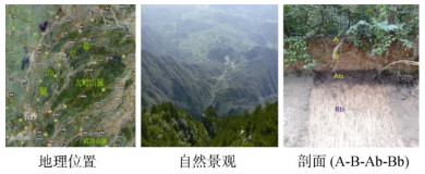1 材料与方法 1.1 供试土壤概况作为研究对象的古山地土壤埋藏遗址(113.818705°E,28.972280°N)位于湘鄂赣交界地带的幕阜山脉,为典型中亚热带花岗岩山体,该山脉最高海拔1 598.6 m,植被和土壤垂直带谱的区域代表性强(图 1)。该古土壤埋藏遗址在国家科技基础性工作专项项目“我国土系调查与《中国土系志》编制”的野外调查过程中被勘探发现并被国内专家讨论。从研究区域所存在的大面积深厚埋藏黑土层以及平整的接合序列剖面构成来看,下部被埋藏的古土壤可能形成于末次冰期,大概率是一次古老的突然性地壳运动坡积后的二次发育结果,成土时间具有典型的第四纪烙印(图 1)。经中国科学院物理研究所利用14C同位素测年法检测(数据详见结果部分),埋藏古淋溶层(Ab)土壤年龄为2 712 a,埋藏古淀积层(Bb)土壤年龄为5 810 a,土壤发生发育的时间与第四纪吻合。