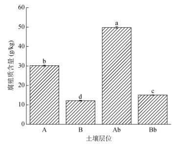 经过2 712 a的埋藏,古土壤各发生层次的腐殖质总量与上覆现代土层的腐殖质总量存在着显著差异(图 2)。埋藏古土壤与现代土壤相同发生层次的腐殖质积累特征相似,即淋溶层的腐殖质积累更为明显。就古土壤而言,其淋溶层(Ab)腐殖质总量为淀积层(Bb)的3.31倍;就现代土壤而言,其淋溶层(A)腐殖质总量为淀积层(B)的2.46倍。
