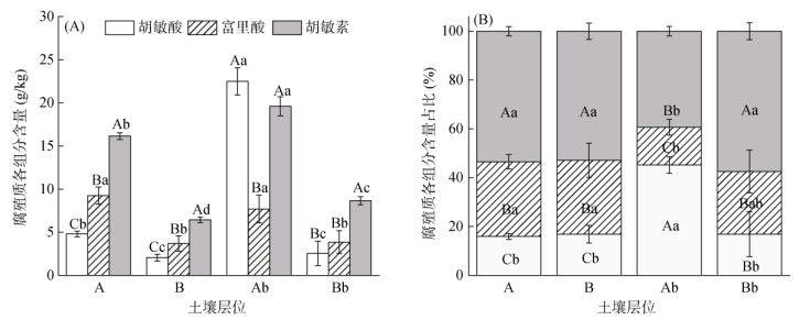 2.3 土壤腐殖质组分特征随着古土壤埋藏深度的增加,古土壤腐殖质各组分含量均呈现下降的趋势(图 3A)。古淋溶层(Ab)的胡敏酸、富里酸以及胡敏素含量均显著高于古土壤淀积层(Bb),且Ab层与Bb层腐殖质各组分的含量占比差异显著。Ab层腐殖质以胡敏酸为主,其次为胡敏素,而富里酸最少,其各组成分含量分别为腐殖质总量的45.2%、39.4% 和15.4%。Bb层腐殖质主要由胡敏素组成,其次为富里酸,而胡敏酸最少,三者含量分别为腐殖质总量的57.5%、25.6% 和16.9% (图 3B)。
