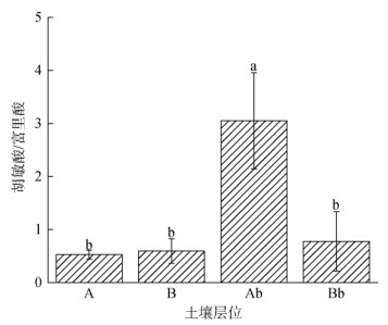2.4 土壤腐殖质质量特征胡敏酸与富里酸的比例是衡量腐殖质品质与腐殖质活性高低的一个重要指标,胡敏酸与富里酸的比值越高,说明土壤中的腐殖质活性越强,腐殖质质量越好[16]。