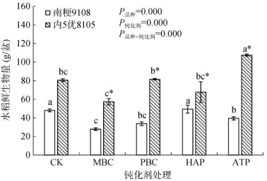 由图 1可知,钝化剂和水稻品种及其交互作用均显著影响了水稻鲜生物量。与CK相比,HAP处理使南粳9108的鲜生物量增加2.9%,ATP处理则使内5优8105的鲜生物量显著增加33.5%(P < 0.05)。在各钝化剂处理下,内5优8108的鲜生物量均大于南粳9108,其中在MBC、PBC和ATP处理下达到显著水平(P < 0.05)。