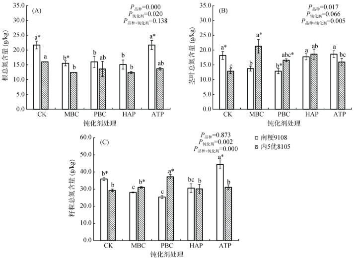 由图 2可知,钝化剂处理显著影响了水稻根部和籽粒的氮含量(P < 0.05)。与CK相比,ATP处理使南粳9108籽粒的氮含量显著增加23.7%;而各钝化剂处理均增加了内5优8105茎叶和籽粒的氮含量,MBC、PBC、HAP和ATP处理分别使内5优8105茎叶氮含量增加65.52%、28.74%、44.83% 和24.14%,籽粒氮含量增加6.06%、27.27%、3.03%和6.06%。水稻品种对水稻各部位氮含量的影响与钝化剂种类有关。各钝化剂处理下南粳9108根部的氮含量均大于内5优8105;而MBC、PBC和HAP处理下,南粳9108茎叶的氮含量则小于内5优8105。钝化剂和水稻品种的交互作用显著影响水稻茎叶和籽粒的氮含量,但未显著影响水稻根的氮含量(图 2)。