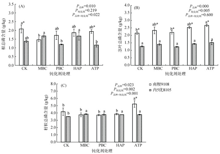 由图 3可知,钝化剂处理显著影响了水稻茎叶和籽粒的磷含量(P < 0.01)。与CK相比,MBC、PBC、HAP和ATP处理分别使南粳9108茎叶的磷含量增加8.29%、2.19%、17.53%、24.00%,内5优8105籽粒的磷含量增加9.71%、7.97%、7.57% 和7.80%。水稻品种也显著影响了水稻根部、茎叶和籽粒的磷含量(P < 0.05)。总体上,南粳9108各部位的磷含量高于内5优8105,其中,在所有钝化剂处理下,两品种茎叶磷含量的差异都达到显著水平(P < 0.05)。