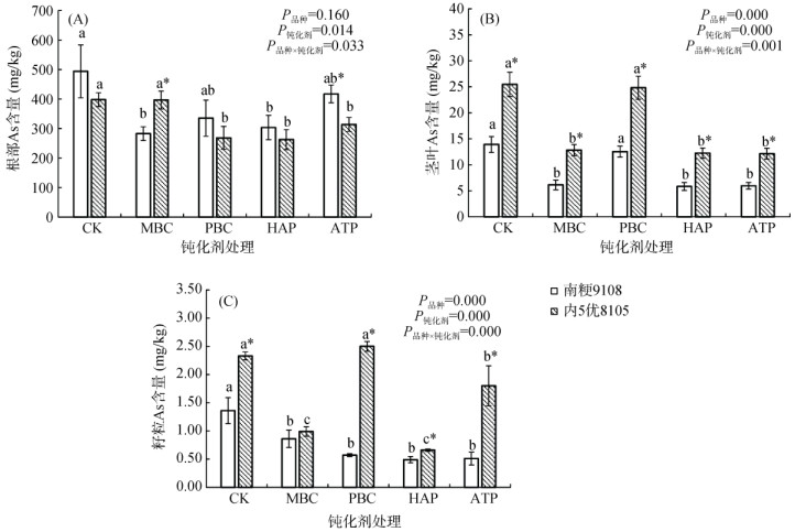 由图 4可知,钝化剂和水稻品种处理均显著影响了水稻茎叶和籽粒的As含量(P < 0.001)。与CK相比,MBC、PBC、HAP和ATP处理使南粳9108茎叶的As含量分别降低55.96%、9.91%、58.12% 和57.18%,籽粒的As含量分别降低36.76%、58.09%、63.97% 和62.50%,其中HAP处理的降幅最大。MBC、HAP和ATP处理也显著降低了内5优8105茎叶和籽粒的As含量。比较不同水稻品种可知,在不同钝化剂处理下,南粳9108茎叶和籽粒的As含量均低于内5优8105,其中在PBC、HAP和ATP处理下均达到显著水平(P < 0.05)。钝化剂与水稻品种的交互作用也显著影响水稻各部位的As含量。