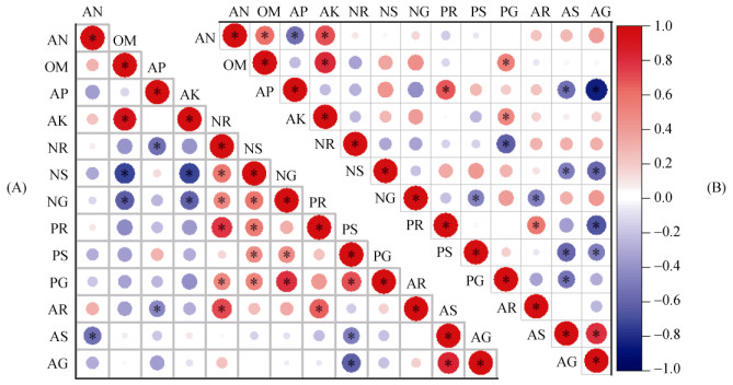(AN:碱解氮;OM:有机质;AP:有效磷;AK:速效钾;NR:根部氮含量;NS:茎叶氮含量;NG:籽粒氮含量;PR:: 根部磷含量;PS:茎叶磷含量;PG:籽粒磷含量;AR:根部As含量;AS:茎叶As含量;AG:籽粒As含量。* 表示相关性达P < 0.05显著水平) 图 5 南粳9108(A)和内5优8105(B)各部位As含量与土壤理化性质的相关性 Fig. 5 Correlations between As contents in different rice tissues with soil physiochemical properties |