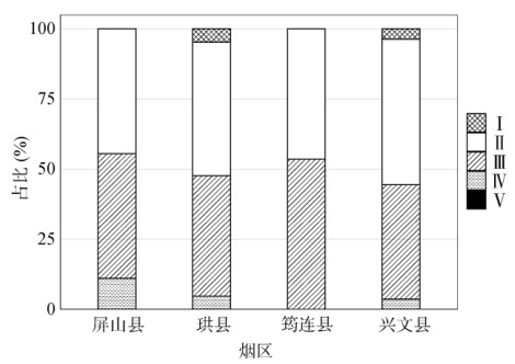 由各烟区的IFI分布情况可知,4个植烟区IFI主要分布在Ⅱ级和Ⅲ级。筠连县IFI处于Ⅱ级和Ⅲ级的烟田占比分别为46.43% 和53.57%;珙县IFI主要处于Ⅱ级和Ⅲ级的烟田占比分别为47.62% 和42.86%,IFI处于Ⅰ级和Ⅳ的烟田占比级较少,均为4.76%;兴文县烟田IFI也主要处于Ⅱ级和Ⅲ级,分别为51.85% 和40.74%,处于Ⅰ级和Ⅱ级的均为3.70%;屏山县烟田IFI处于Ⅱ级和Ⅲ级的均为44.44%,处于Ⅳ级所占比例为11.11%(图 1)。