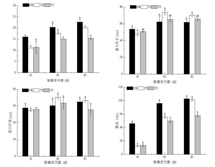 移栽后45 d (图 1),与CK相比,T1、T2处理的烟株株高和叶片数均显著降低(P < 0.05),降幅分别为73.40%、71.01%和31.25%、29.18%。移栽后65 d,T1和T2处理的株高分别显著降低了27.11% 和33.40%(P < 0.05),叶片数分别显著降低了13.08% 和26.22%(P < 0.05);T1的最大叶片长显著增加了18.18% (P < 0.05)。栽后85 d,与CK相比,T2的株高和叶片数分别显著降低了14.85% 和19.11%(P < 0.05);T1的叶片数显著减少了11.78%,最大叶长显著增加了13.21%(P < 0.05)。