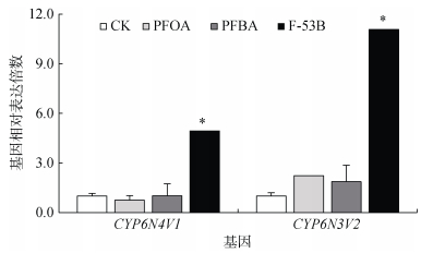 2 结果与分析 2.1 PFASs急性毒性试验的mRNA诱导表达量 2.1.1 氧化应激相关基因经48 h PFOA、PFBA、F-53B染毒酵母饲料喂养后,白符跳体内两种细胞色素P450单加氧酶基因(CYP6N3V2、CYP6N4V1) mRNA转录水平呈现不同规律(图 1)。与对照相比,3种PFASs处理下,CYP6N3V2表达均上调,依次为PFOA 2.23倍、PFBA 1.87倍、F-53B 11.07倍,其中,F-53B处理下达到显著水平。CYP6N4V1基因表达则表现为F-53B暴露下显著上调4.94倍。