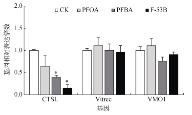 4 结论PFASs对土壤白符跳氧化应激及生殖相关基因的表达具有显著影响。CYP6N3V2、CYP6N4V1、CTSL、VMO1和Vitrec等5个差异表达基因可作为基于PFASs暴露的土壤白符跳早期预警指标的靶标基因。相对于PFOA、PFBA化合物,F-53B对上述基因mRNA转录水平调控的影响程度最大。推测相较于前两种化合物,F-53B可能具有更强的生物毒性。不同PFASs对土壤白符跳的氧化应激、生殖相关基因具有显著影响,这一发现为此类污染物的早期监控奠定了基础。