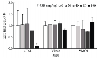 喂食含F-53B浓度梯度酵母饲料28 d后,F-53B 160 mg/kg处理组的CTSL mRNA表达较对照处理组显著降低89.9% (图 3);20、40、80 mg/kg F-53B处理组与对照间无显著差异。