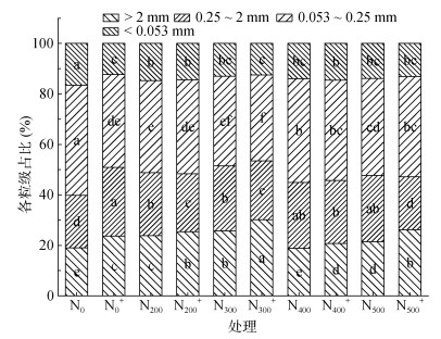 (图中小写字母不同表示相同粒级团聚体不同处理间差异显著(P < 0.05),下同) 图 1 氮肥及其与牛粪配施对土壤各粒级团聚体占比的影响 Fig. 1 Effect of nitrogen fertilizer combined with cattle manure on proportion of soil aggregates |