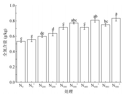 (图中小写字母不同表示处理间差异显著(P < 0.05),下同) 图 2 氮肥及其与牛粪配施对土壤全氮含量的影响 Fig. 2 Effect of nitrogen fertilizer combined with cattle manure on soil total nitrogen content |