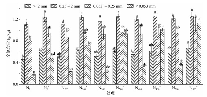 图 3 氮肥及其与牛粪配施对各粒级团聚体中全氮含量的影响 Fig. 3 Effect of nitrogen fertilizer combined with cattle manure on total nitrogen contents in aggregates with different particle sizes |