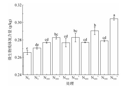 图 4 氮肥及其与牛粪配施对土壤中微生物残体氮含量的影响 Fig. 4 Effect of nitrogen fertilizer combined with cattle manure on nitrogen contents of microbial residues in soil |