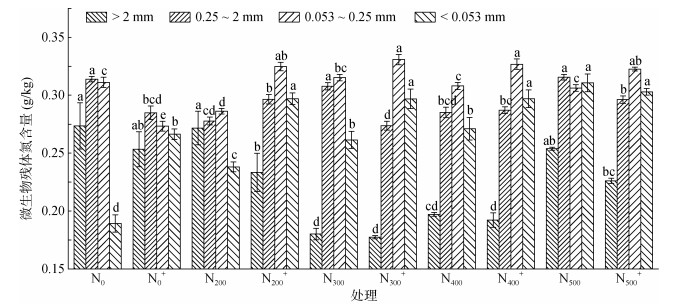 图 5 氮肥及其与牛粪配施对各粒级团聚体中微生物残体氮含量的影响 Fig. 5 Effect of nitrogen fertilizer combined with cattle manure on microbial residue nitrogen contents in aggregates with different particle sizes |