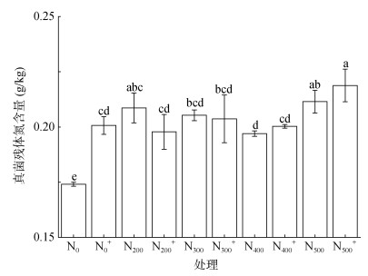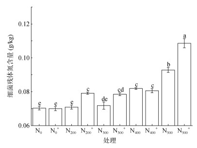 细菌残体氮含量分别占微生物残体氮以及全氮含量的26.48% ~ 35.69% 和9.97% ~ 13.19%。单施氮肥时,施氮量为400和500 kg/hm2时显著增加了细菌残体氮含量。施氮量为200、300和500 kg/hm2时,配施牛粪显著增加了细菌残体氮含量,其中施氮量为500 kg/hm2时,增加幅度最大,为17.03%(图 8)。