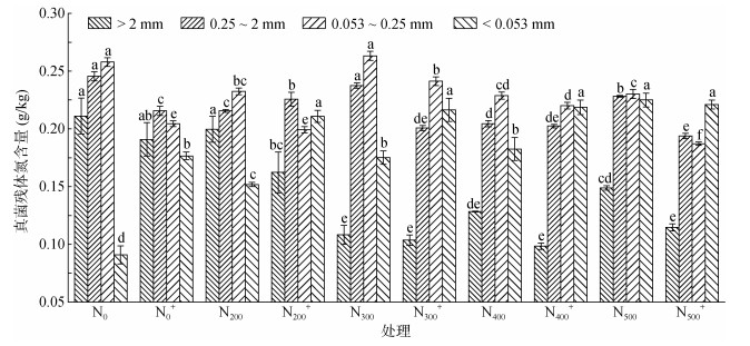 图 7 氮肥及其与牛粪配施对各粒级团聚体中真菌残体氮含量的影响 Fig. 7 Effect of nitrogen fertilizer combined with cattle manure on fungal residue nitrogen contents in aggregates with different particle sizes |