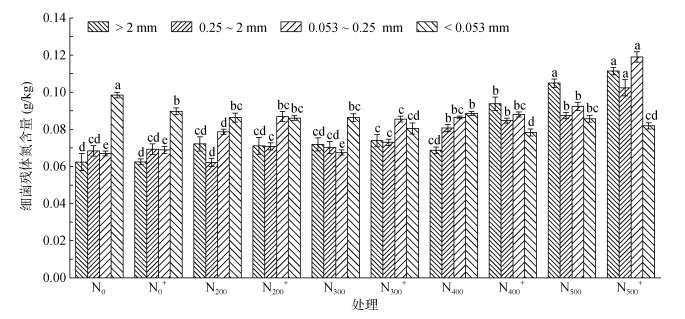 图 9 氮肥及其与牛粪配施对各粒级团聚体中细菌残体氮含量的影响 Fig. 9 Effect of nitrogen fertilizer combined with cattle manure on bacterial residue nitrogen contents in aggregates with different particle sizes |