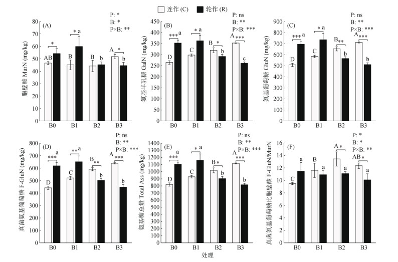 (不同大写字母表示连作耕作模式土壤中不同量生物质炭处理组之间差异显著(P < 0.05);不同小写字母表示轮作耕作模式土壤中不同量生物质炭处理组之间差异显著(P < 0.05);***表示极其显著(P < 0.001),**表示极显著(P < 0.01),*表示显著(P < 0.05),ns表示不显著(P > 0.05),下同) 图 1 不同耕作模式中土壤氨基糖的含量 Fig. 1 Content of soil amino sugars under different tillage practices |