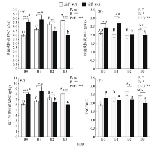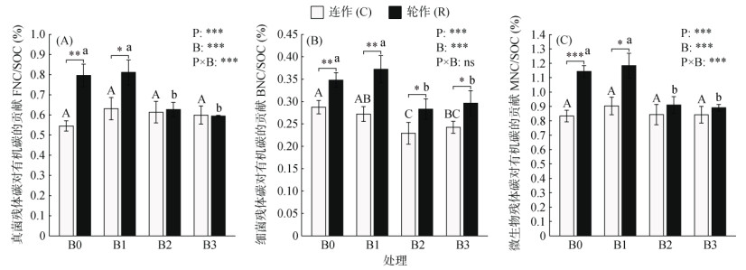 由图 3可知,耕作模式、生物质炭处理及其交互作用对FNC/SOC、MNC/SOC有显著影响,耕作模式、生物质炭处理对BNC/SOC显著影响。在连作中,与C-B0相比,C-B1、C-B2、C-B3中BNC/SOC均有下降,分别下降了5.32%、20.24%、15.69%(图 3B)。在轮作中,与R-B0相比,R-B1中FNC/SOC、BNC/SOC、MNC/SOC均无显著差异且为最大值,R-B2和R-B3均显著降低(P < 0.05),分别下降了21.23%、18.65%、20.45%和25.35%、14.83%、22.15%。在生物质炭B0、B1下,连作中FNC/SOC、BNC/SOC、MNC/SOC显著低于轮作(P < 0.05);在生物质炭B2、B3下,轮作中BNC/SOC显著高于连作(P < 0.05)。