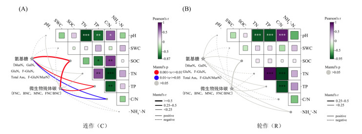 由图 4可知,在连作中,pH与TN、TP显著负相关,与C/N显著正相关;SOC与C/N显著正相关,与TP显著负相关;TN与TP显著正相关,与C/N显著负相关;土壤氨基糖、微生物残体碳受SOC、TP、C/N的显著正影响(P < 0.05),其中受SOC影响最大(图 4A)。在轮作中,pH与TN、TP显著负相关,与C/N显著正相关;TN与TP显著正相关,与C/N显著负相关;TP与C/N显著负相关(P < 0.05);而土壤氨基糖和微生物残体碳与土壤理化性质无显著相关性(图 4B)。