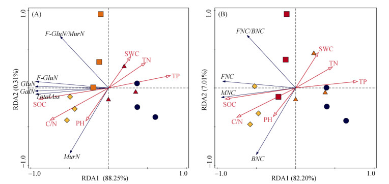 (pH,酸碱度;SWC,含水量;SOC,有机碳;TN,全氮;TP,全磷;C/N,有机碳与全氮之比;MurN,胞壁酸;GalN,氨基半乳糖;GluN,氨基葡萄糖;F-GluN,真菌氨基葡萄糖;Total Ass,氨基糖总量;F-GluN/MurN,真菌氨基葡萄糖与胞壁酸之比;FNC,真菌残体碳;BNC,细菌残体碳;MNC,微生物残体碳;FNC/BNC,真菌残体碳与细菌残体碳之比) 图 5 连作模式中土壤氨基糖及微生物残体碳与土壤理化性质的RDA分析 Fig. 5 Redundancy analysis (RDA) of soil amino sugars and microbial residue carbon in relation to soil physicochemical properties under cropping patterns |
