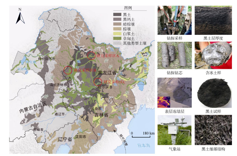 1 材料与方法 1.1 研究区概况选取东北黑土带沿经度梯度分布的3个典型区域为研究区(图 1):黑河市孙吴县(A区,寒温带过渡区,127°18′21″E ~ 127°21′06″E,49°30′52″N ~ 49°33′46″N)、齐齐哈尔市克山县(B区,温带核心耕作区,125°11′26″E ~ 125°18′33″E,48°16′25″N ~ 48°20′17″N)及哈尔滨市香坊区(C区,暖温带城市化影响区,126°43′36″E ~ 126°46′22″E,45°43′56″N ~ 45°46′21″N),形成纬度跨度达3.9°的梯度观测网络(图 1)。研究区覆盖黑土典型亚类(厚层黑钙土、普通黑土、草甸黑土),其土壤发育年龄(8 000 ~ 12 000 a)、有机质含量(38 ~ 62 g/kg)及黏粒矿物组成(2∶1型黏土矿物占比58% ~ 73%),具有显著区域分异特征[14, 25-26]。研究区年均冻融循环次数达25 ~ 38次,最大冻深梯度呈现北纬递增规律(A区218 cm > B区182 cm > C区156 cm)[14, 24-26]。