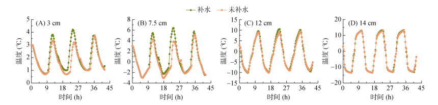 图 10 不同补水条件下各高度温度变化情况 Fig. 10 Temperature variations at different depths under different water replenishment conditions |