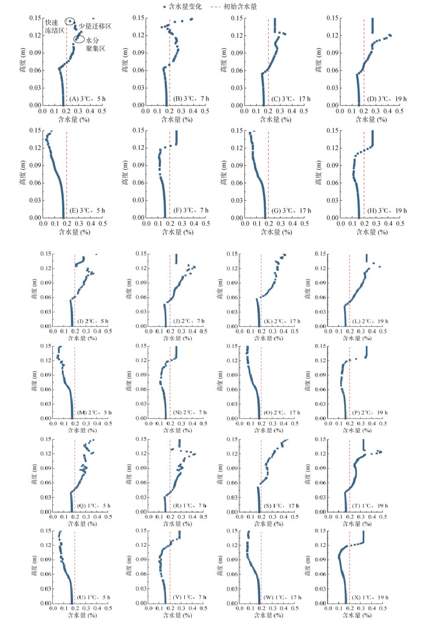 总含水量整体呈上高下低趋势(图 11A ~ D、I ~ L、Q ~ T),根据水分迁移速率差异,可将土层自上而下划分为:快速冻结区(靠近冷端),温度梯度大,水分原位冻结为主,迁移受限;少量迁移区(中部),降温速率减缓,未冻水部分迁移;水分积聚区(远离冷端),温度稳定,未冻水在低负温下缓慢冻结,迁移剧烈,含水量达峰值。随着冻融循环次数增加,下部水分逐渐向中上部迁移,表明冻结过程中水分受温度梯度驱动发生定向迁移。