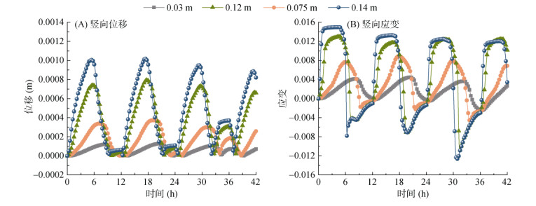 图 12 考虑补水冻融过程竖向位移及应变曲线 Fig. 12 Vertical displacement and strain curves during freeze-thaw cycles with water replenishment |