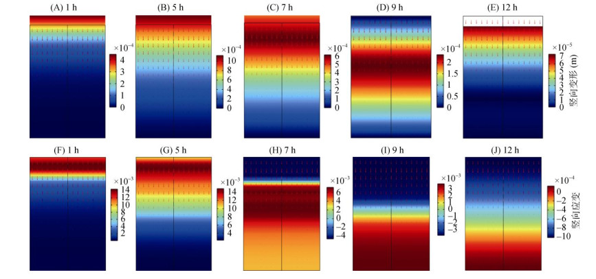 (图A ~ E为竖向变形云图;F ~ J为应变云图) 图 13 考虑补水冻融过程竖向位移及应变云图 Fig. 13 Vertical displacement and strain contour maps during freeze-thaw cycles with water replenishment |