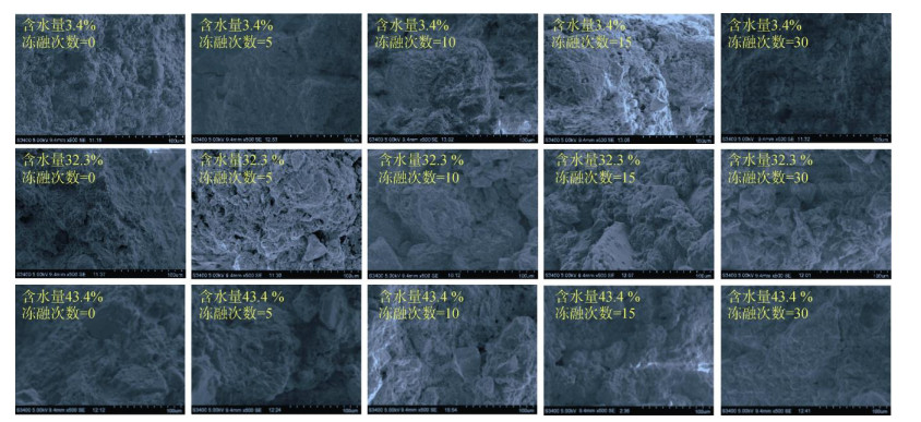 图 14 不同含水量及冻融次数下代表性黑土扫描电镜(SEM)图像 Fig. 14 Representative scanning electron microscope (SEM) images of soil samples with different water contents and freeze-thaw cycles |