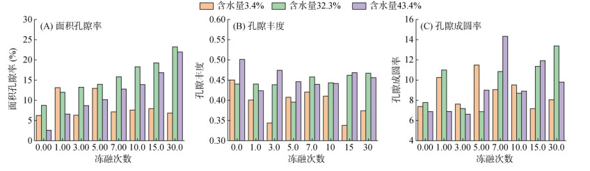 图 15A为不同冻融循环次数后面积孔隙率变化特征,其中初始孔隙率为5.73%(初始含水量3.4%)、8.75%(初始含水量32.3%)、2.52%(初始含水量43.4%);30次冻融后,孔隙率分别增至6.97%、23.14%、22.18%,增长率分别达21.62%、164.36%、546.47%。可以看出,初始含水量越高,冻融对孔隙率的提升效应越显著(初始含水量43.4% 样本因冻胀主导,孔隙扩展幅度最大)。