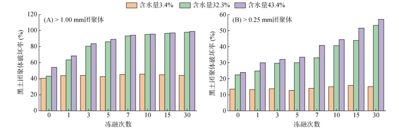 图 16为不同含水量及冻融次数下黑土团聚体破坏率,可以看出:对于团聚体 > 1.00 mm(粗颗粒),高含水量样本(43.4%)的初始破坏率达54.2%,显著高于低含水量样本(3.4%)的40.7%。另外,破坏率冻融响应随冻融次数快速上升(5次冻融后达89.2%,30次后达99.0%),其中10次冻融后增速趋缓。这是由于高含水量下冰晶生长产生膨胀应力,直接破坏大颗粒间连接。