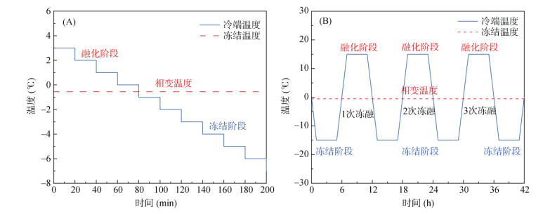 (A. 单向冻结温度变化曲线;B. 冻融循环温度变化曲线) 图 2 单向冻结及冻融循环温度边界曲线 Fig. 2 Temperature boundary curves for unidirectional freezing and freeze-thaw cycles |