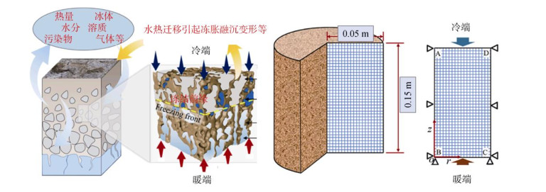 另外,冻融锋面的推进促使水分向相变界面富集,伴随相变潜热释放/吸收的热质传输过程,导致温度场与水分场呈现动态互馈关系。这种互馈效应通过改变土体孔隙结构(孔隙比e)与冰透镜体发育模式,继而影响有效应力分布。同时,应力场演变通过调控土体导热特性与渗透性能,反向约束温度场与水分场的时空演变,构成完整的水–热–力三场耦合系统。本研究构建的水热迁移机制模型及试样几何参数如图 3所示[27],模型参数如表 2所示。