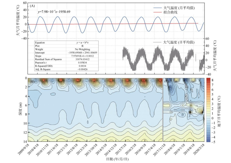 研究区位于多年冻土与季节性冻土过渡带,气候变暖及工程扰动加速了多年冻土退化。2009—2020年大气温度监测数据(图 4A)显示,月均温呈缓慢上升趋势,且与拟合曲线趋势一致。地温响应呈现显著季节性波动,峰值出现于每年9月,并随土层深度增加逐渐衰减(图 4B)。地温等值线图(图 4C)进一步揭示,研究区冻土退化表现为上下限同步异向迁移:下限上升速率(年均0.21 m)显著高于上限下降速率(年均0.07 m),冻融循环频次增加32% ~ 45%,表明冻土热稳定性持续弱化。