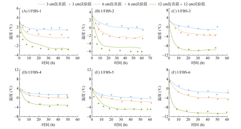 表 4 不同试件单向冻结温度试验值及仿真值相关系数 Table 4 Correlation coefficients between tested and simulated values of unidirectional freezing temperatures at different depths |