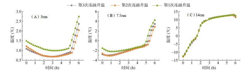 图 7 不同高度三次冻融过程中升温变化曲线 Fig. 7 Temperature rise curves during three freeze-thaw cycles at different heights |