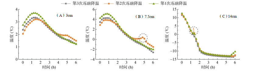 图 8 不同高度三次冻融过程中降温变化曲线 Fig. 8 Temperature drop curves during three freeze-thaw cycles at different heights |