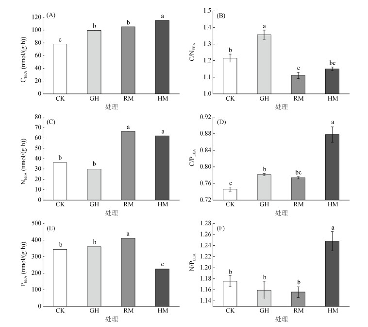 1.5 数据处理与分析本研究分别以酶活性比(βG+CBH)/NAG、(βG+ CBH)/ACP及NAG/ACP表示土壤酶活性碳氮比(C/N)、碳磷比(C/P)和氮磷比(N/P),并采用对数转换后的计量比值表征胞外酶活性(EEA)化学计量比[18]。计算公式如下: