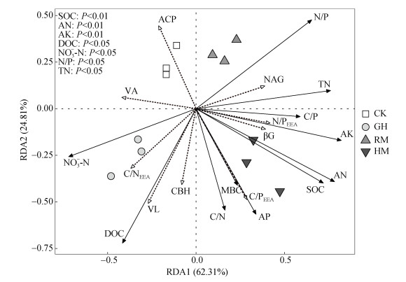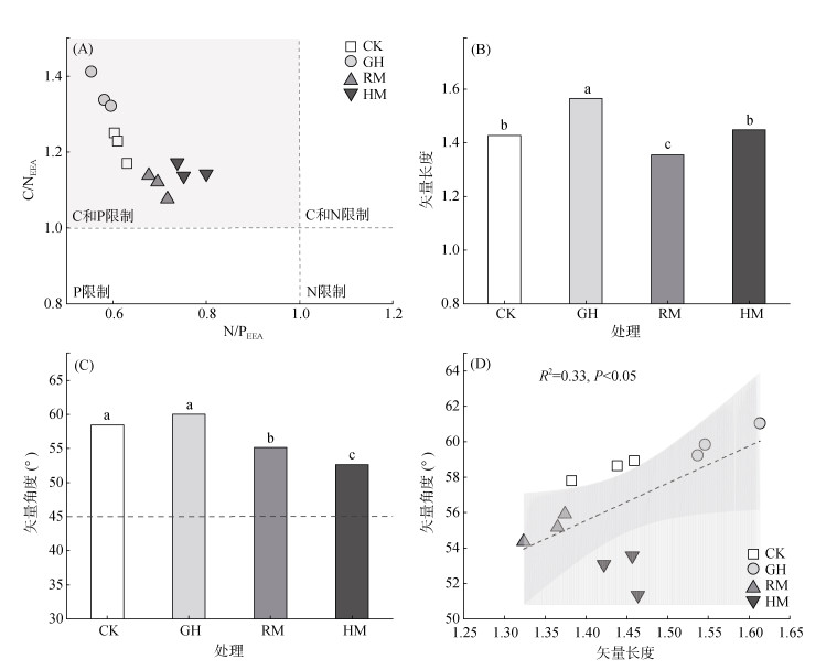 2.3 土壤微生物养分限制特征土壤胞外酶活性化学计量比计算结果显示,C/NEEA平均为1.21,N/PEEA平均为0.79。如图 2A所示,各处理的所有样本均落在土壤微生物碳和磷共同限制区域,其中RM和HM处理磷限制减弱(图 2A)。土壤酶化学计量的矢量特征如图 2B、2C所示,所有样本的矢量长度均大于1,矢量角度均大于45°,表明长期稻草覆盖、香根草篱措施以及香根草篱联合稻草覆盖下土壤微生物生长代谢同时受到碳和磷的限制。相比CK处理,RM处理矢量长度显著降低5.1%,而GH处理显著增加9.7%,表明稻草覆盖使得微生物受碳限制的程度降低,香根草篱显著提高了碳限制。相比CK处理,RM和HM处理矢量角度分别显著降低5.7% 和9.9%,表明两种措施下土壤微生物磷限制均减弱。