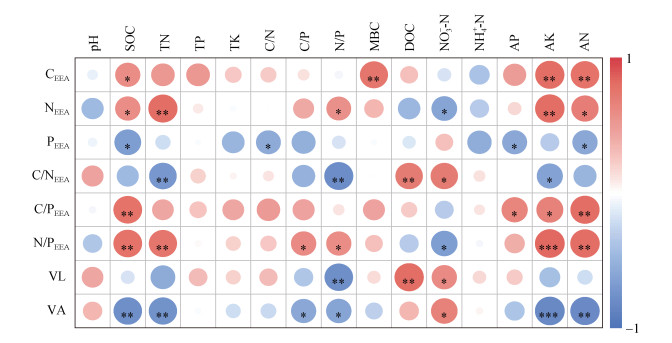(图中*、**、***分别表示相关性达P < 0.05、P < 0.01、P < 0.001显著水平) 图 3 土壤酶活性及其化学计量特征与土壤理化性质的相关性 Fig. 3 Correlations of soil physicochemical properties with enzymatic activities and enzymatic stoichiometry |