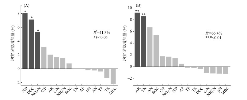 (图中*、**分别表示在P < 0.05、P < 0.01水平影响显著) 图 5 随机森林模型分析土壤理化性质作为矢量长度(A)和矢量角度(B)驱动因素的贡献 Fig. 5 Contribution of physicochemical properties to vector lengths (A) and angles (B) obtained by using a random forest model |