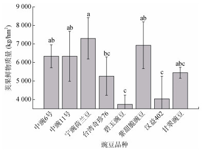 (图中小写字母不同表示不同豌豆品种间差异显著(P<0.05),下同) 图 1 不同豌豆品种荚果鲜物质量 Fig. 1 Pod fresh weights of different pea varieties |