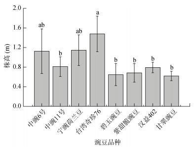 不同豌豆品种在红壤旱地的株高存在较大差异(图 2)。在所有品种中,台湾奇珍76的株高最高(1.48 m),其次为宁豌荷兰豆和中豌6号(1.15和1.13 m),其他品种则较低,株高范围在0.62 ~ 0.81 m。